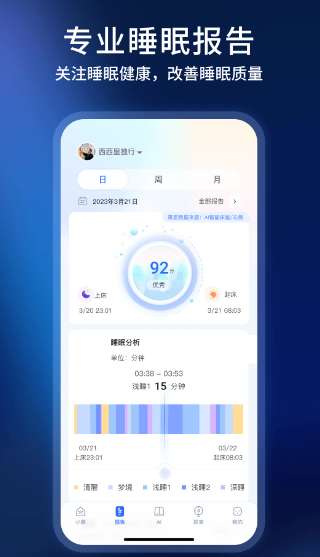 3、睡眠报告——展示用户的睡眠周期,统计分析深睡浅睡、REM、清醒占比,并给出合理的睡眠评分。