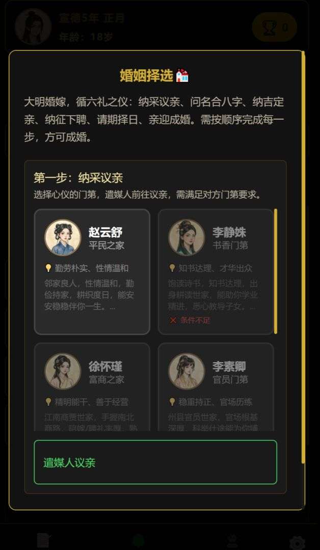 凡人百年志:大明篇是一款以明朝宣德年间为背景的人生模拟游戏,玩家将化身十六岁的江南市井少年,出身平凡家境贫寒,辞别双亲后独自闯荡世间。游戏里没有既定的人生路线,玩家可以凭借自己的选择,一步步走出专属的人生道路,既能埋头苦读奔赴科举考场,也能奔走四方打拼生意,还能经营家族绵延子嗣,亲身感受明朝江南的烟火气息,体验从无名小辈到成就一番事业的完整人生历程,每一次选择都会改写命运,让这段大明浮生之旅充满变数。