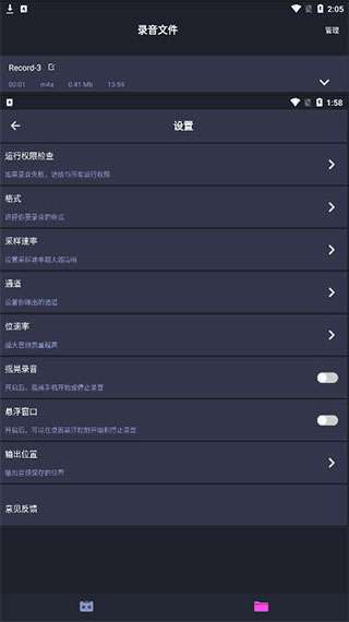 2、点击主页面的右上角,将会看到运行权限检查、格式、采样速率、通道、位速率、摇晃录音、悬浮窗口、输出位置、意见反馈,用户可以随意的进行调整。