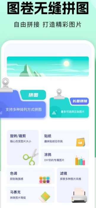 图卷app是一个超级好的图片美化软件。这里主要包括图片拼接、添加贴纸、调色、马赛克、图片裁剪等各种专业的照片编辑工具。它支持用户自由使用,更方便地创建美丽的高清图片,从而享受专业级的照片编辑体验,高效地创建自己的美丽图片。此外,该软件还提供了大量精美的拼图模板。通过在线预览拼图模板的应用效果,可以帮助用户轻松创作出同风格的精美作品,让用户解锁更多拼接图片的灵感,让创作出来的图片更有质感。