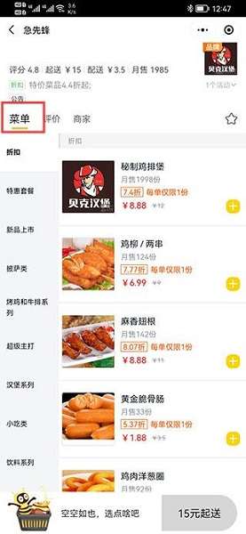 3、点击店名,就可以进入店中点餐了,还可以看到起送价格,配送费是多少,还有月售、菜单、评价、商家。