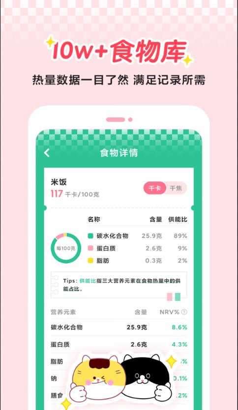 3、海量食物库,10W+食物供你选择,清晰可见的营养元素和热量。