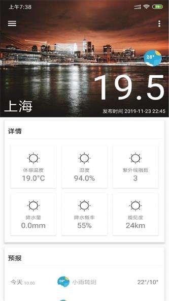 这款天气预报软件上有着最准确的天气数据,每隔一段时间就会自动更新天气情况,即使突然变天也不怕,可以添加多个地区,现实完整的天气数据,位置信息、温度、气压、空气湿度、风力等信息,看起来简单明了,还有7天预报让你放心的提前做计划哦!