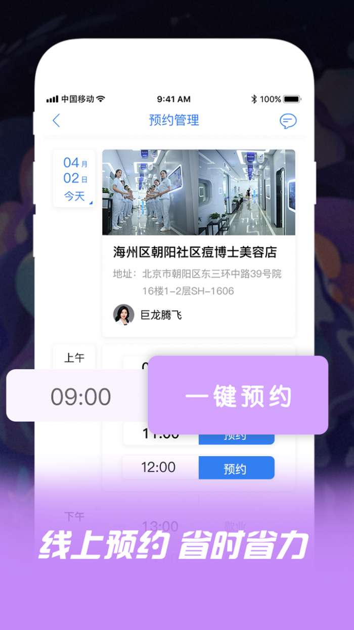 1、还有着一键预约功能,让你可以在上面去进行一键预约线下相关的皮肤管理美容店。