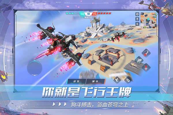 4、对战模式(乱斗)。这是重装上阵手游中的公平竞技类型的模式。这里没有氪金系统(只有皮肤付费)、没有符文、没有初始加成,完全公平不存在氪金就能变强的情况。比赛开始后,10个玩家的初始机械车完全相同。玩家在同一地图,15分钟之内,通过拾取零部件改造车身或者直接“寄生”到新机械车完成进化,进化后与其他玩家竞争生存,活到最后且得分最高者“吃鸡”。ps:天上会掉落零件和成品车,抢到高级成品车可以瞬间咸鱼翻身~