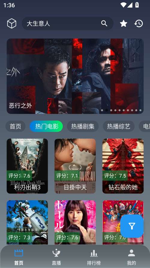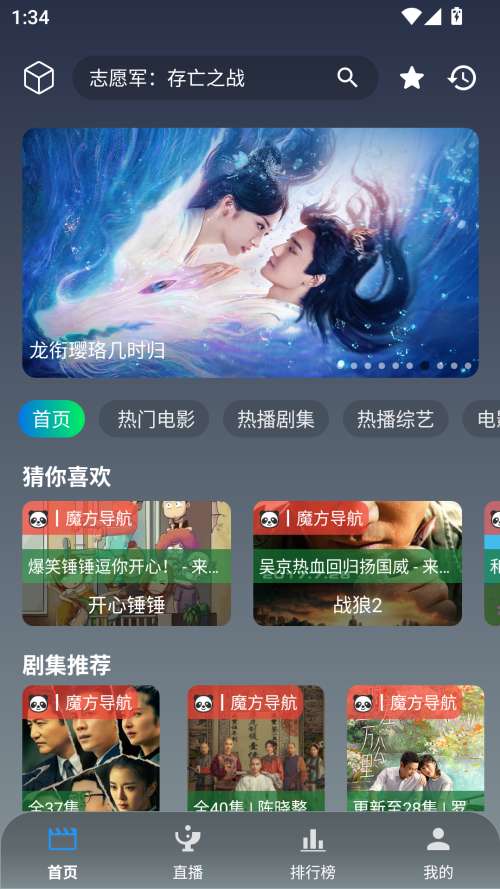 1、打开魔方影仓,首页展示了最近热门的电视剧、热门电影、热门综艺等等。