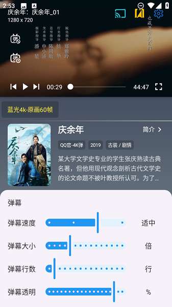 3、然后就可以根据需求,自定义调整弹幕速度,大小,行数以及透明度了。