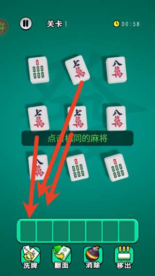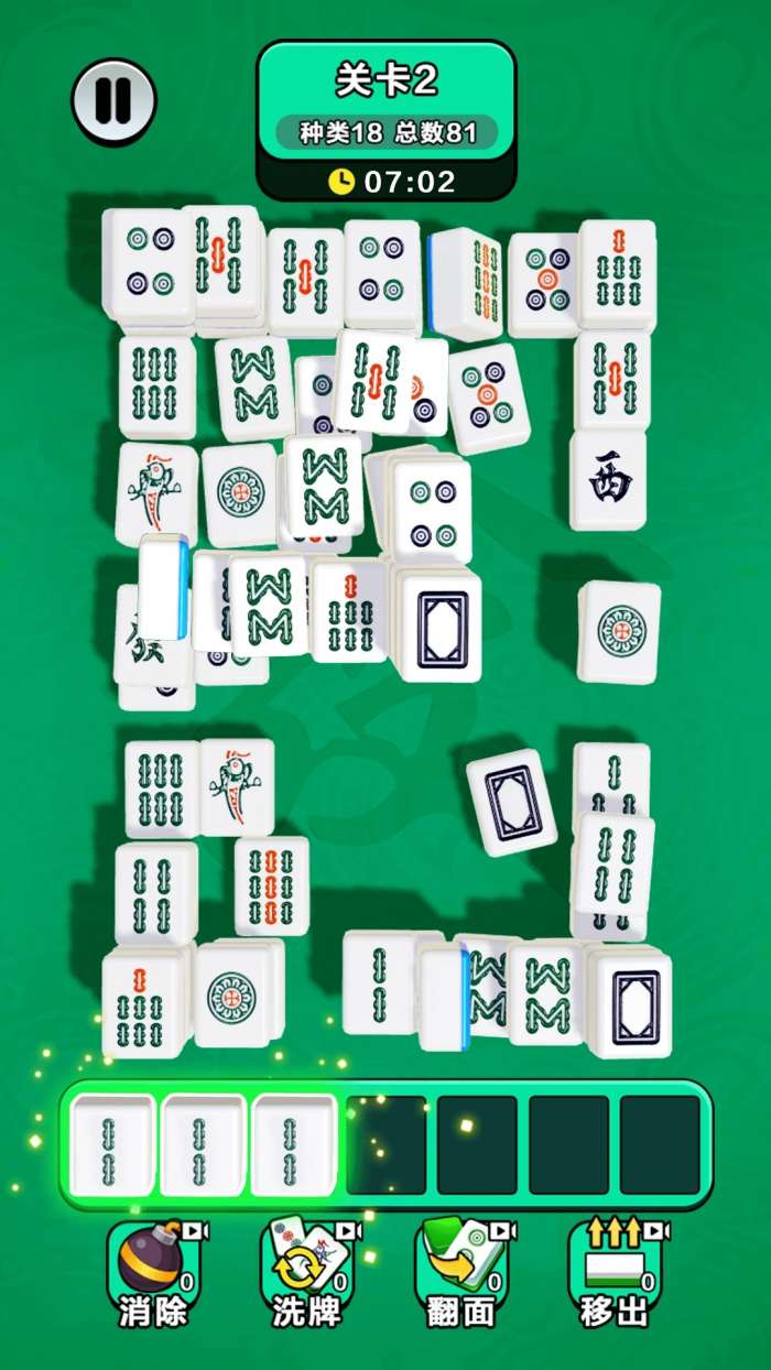 1、打开游戏后,首先完成新手引导教程,学习如何通过点击选中并消除三个或以上相同花色的麻将牌,了解基础规则和得分机制。