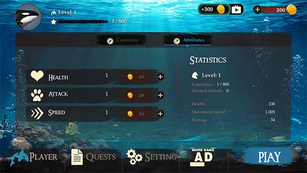 1. 使用金币能够增添属性点,还能查看虎鲸的详尽数据,点击“play”即可开启游玩。