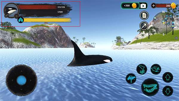 2、通过向左移动摇杆按钮,能够操控虎鲸的行动方向;而右边的摇杆按钮,则用于控制虎鲸做出诸如喷水、跳跃、攻击等动作。