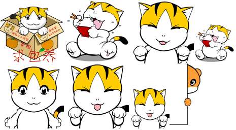 可爱的小黄猫,和一个橙色的小熊。表情有坐在一起谈恋爱,汗,吃饱了摸肚子,玩杂技,难过,用尾巴支着身体滑动,想办法,向下飞,哭,扛着口袋集体跑过,舔爪子,顶柿子,抡拳,啃东西吃。