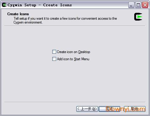 安装的时间依据你选择的组件以及网络情况而定。安装完成后,安装程序会提示是否在桌面上创建cygwin图标等,点击完成退出安装程序。