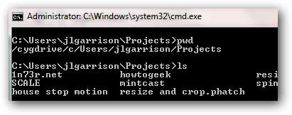 正如下面的图片里所看到的,pwd和ls在windows命令提示符工作正常。你还会看到/cygdrive/c自动被添加到当前目录显示里面了。