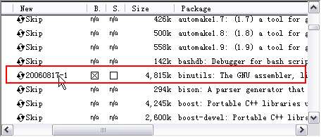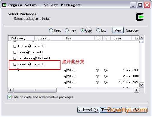 这一步,我们选择需要下载安装的组件包,为了使我们安装的cygwin能够编译程序,我们需要安装gcc编译器,默认情况下,gcc并不会被安装,我们需要选中它来安装。为了安装gcc,我们用鼠标点开组件列表中的“devel”分支,在该分支下,有很多组件,我们必须的是: