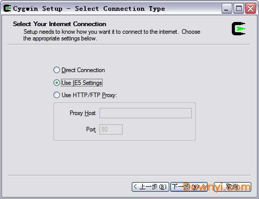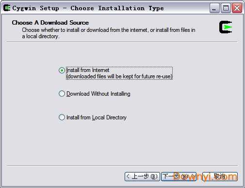 从上述三种模式中选择适合你的安装模式,这里我们选择第一种安装模式,直接从网上安装,当然在下载的同时,cygwin组件也保存到了本地,以便以后能够再次安装。选中后,点击“下一步”,