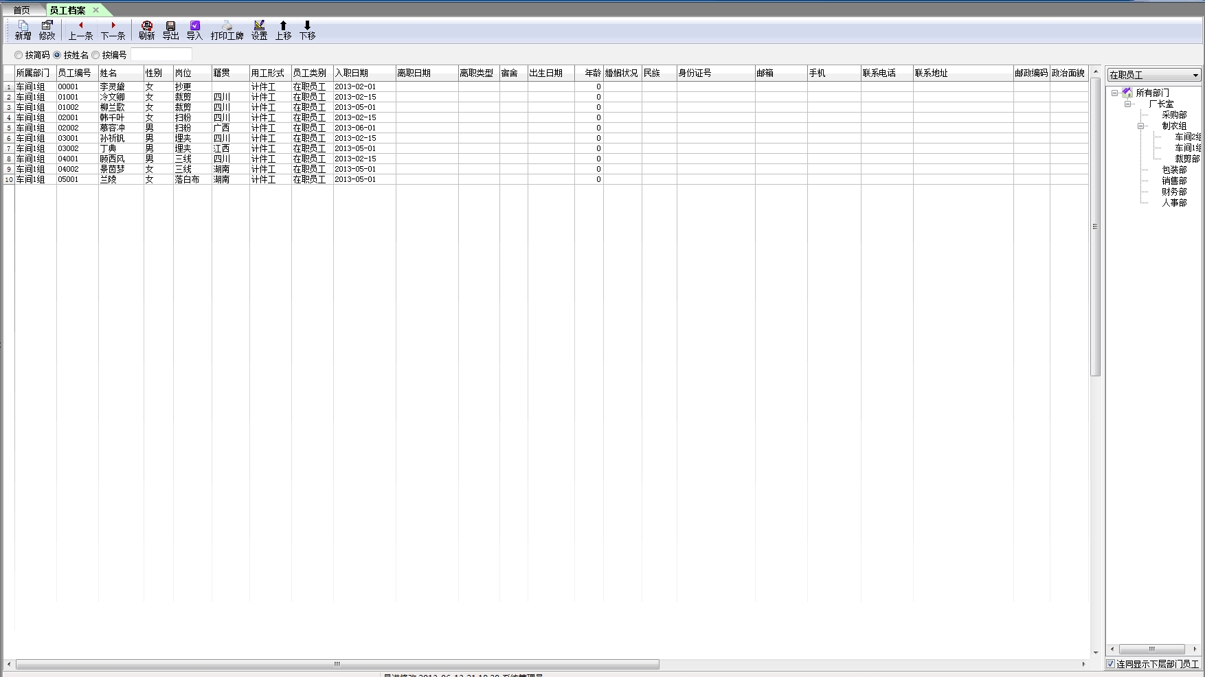 用于录入公司各员工的档案数据,员工编号可自行编号或系统自动编号,编号规则可在(设置)菜单下选择(员工编号规则)进行设置。