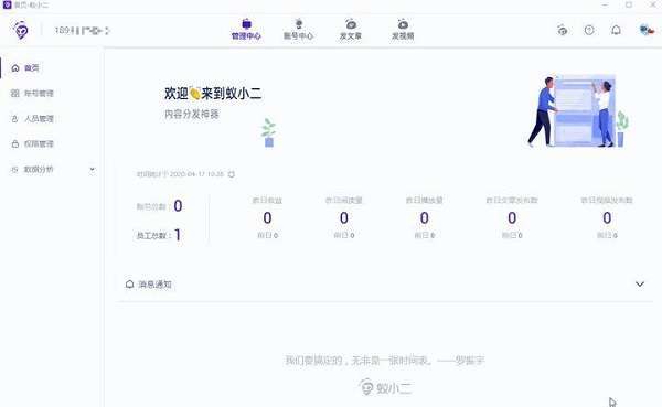进入【管理中心】的【首页】栏目,可查看最新账号总数、员工总数及昨日相关统计数据等;【消息通知】栏可查看系统消息及不同平台的后台消息。