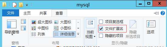 3、在系统窗口的“查看”中将“文件扩展名”勾上,便于确保my.ini文件扩展名正确性,如下图: