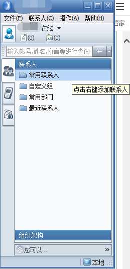 组织架构——找到你要加的人的科室——右键——添加到常用联系人或直接在上面输入姓名,找到后右键,添加到常用联系人