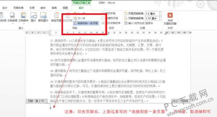 2、我们可以看到光标会马上跳转到下一页,之后分别使用鼠标左键在页眉、页脚处双击,将“链接到前一条页眉”选项取消选中状态。