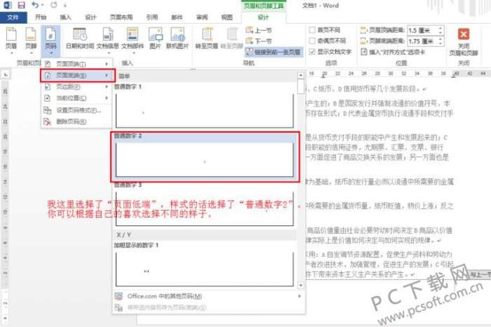 4、再次点击工具栏中的“页码”选项,将鼠标光标指向下拉菜单中的“页面底端”一栏,在右侧出现的子菜单中,可以选择页码的形式,找到中意的选项后,点击选中即可。