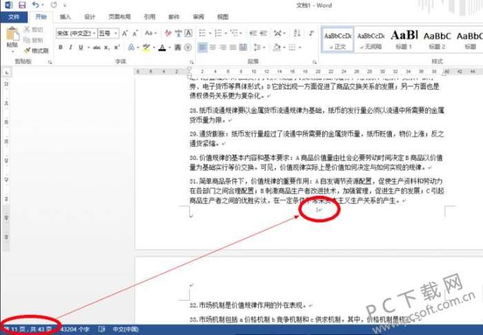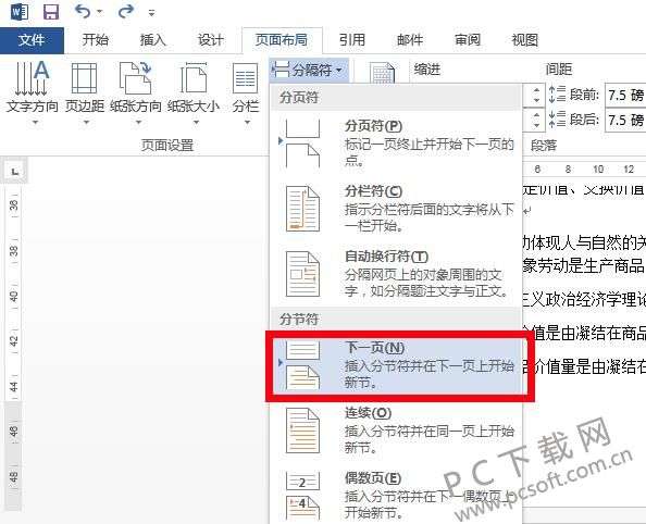 1、打开office2013中的word模块,并打开需要设置页码的文档,可以看到此文档共有43页。假设我们要从第11页开始添加页码,首先将输入光标放在第10页的最后,然后点击顶部菜单栏中的“页面布局”选项,点击打开“分隔符”下拉菜单,在菜单中选择“下一页”选项。