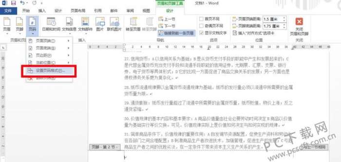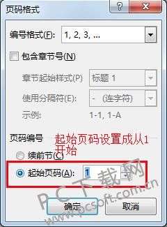3、再点击工具栏中的“页码”按钮,在打开的下拉菜单中选择“设置页码格式”选项,用户可以根据需要来对页码进行修改,注意起始页码要根据实际情况填写。修改完成后点击“确定”。