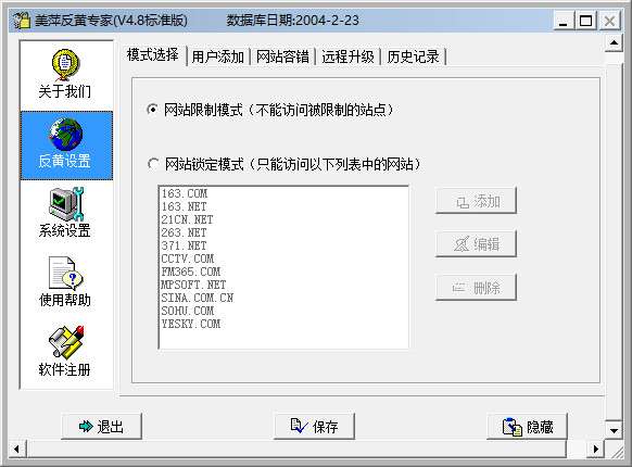 网站限制模式:软件的缺省模式,用户可以访问任何站点。但在访问时被反黄专家监控,使之不能访问被限制的站点。