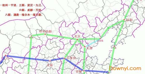 四纵:沈阳-唐山-北京-张家口—大同—呼和浩特-包头-延安-西安-安康—广安-重庆-泸州—宜宾-昆明……景洪……琅勃拉邦.万象.曼谷.新加坡。
