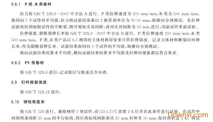 增加了拉伸强度、弹性恢复率、穿刺性能、不透水性、卷材与卷材剥离强度(搭接边)、卷材防粘处理处防粘处理部位剥离强度试验方法;修改了抗冲击性能、渗油性、抗窜水性、与后浇混凝土剥离强度、与后浇混凝土浸水后剥离强度、热老化、尺寸变化率试验方法(见第6章,2009年版的第5章);一修改了出厂检验项目(见7.1.1,2009年版的6.1.1)。