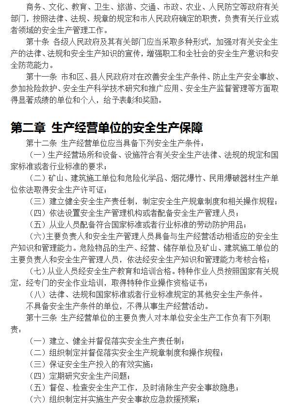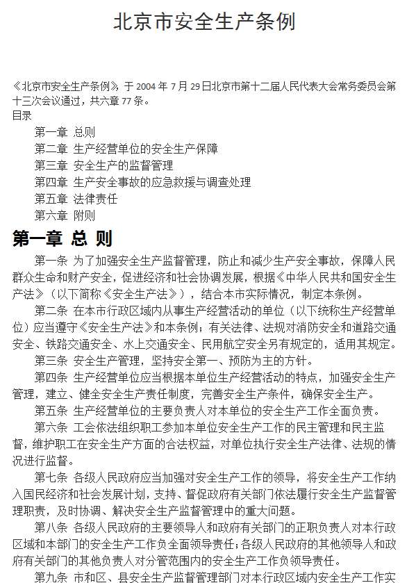 北京市安全生产条例,2004年7月29日北京市第十二届人民代表大会常务委员会第十三次会议通过,共六章77条。内容概要如下: