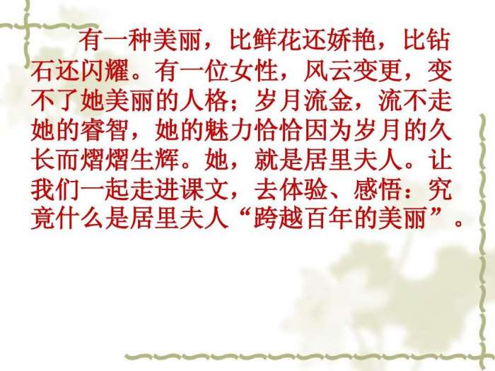 《跨越百年的美丽》是当代散文家、科普作家梁衡于1998年创作的一篇散文。此文是一篇赞美居里夫人的文章,通过讲述了居里夫人不顾镭射线以及化学药品的侵蚀,坚持进行科学研究的故事,充分体现了其坚定执著,淡泊名利,刚毅顽强,为科学献身的精神。全文综合运用了对比等写作手法,绘形有神,传情有致,析理入微,收一种综合之美。