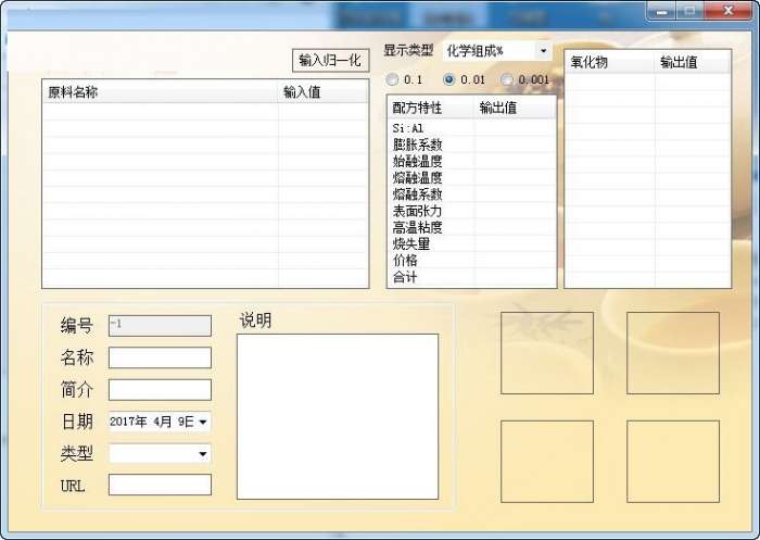 软件集成了常用配方性能计算,其包括:配方的坯(釉)式、耐火度、烧成温度、熔融温度、酸性系数等,以保证快速、简便、准确;为陶瓷配方设计提供技术参数参考。