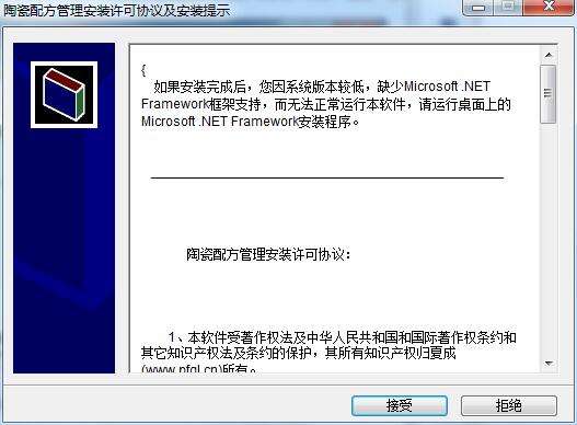 1、首先,下载并解压软件,双击“taocipf_4.02.exe”进入陶瓷配方管理软件安装许可协议,点击“接受”进入下一步。