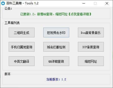 百科工具箱 v1.2绿色版百科工具箱是一款非常实用的工具箱软件,支持二维码生成、中英文翻译、缩短网址等多种功能,界面简洁,操作简单,满足了用户的各种需求,需要的朋友快来下载吧。 功能介绍 二维码生成:生成二维码+保存 去水印:全网去水印下载 Dou音bg