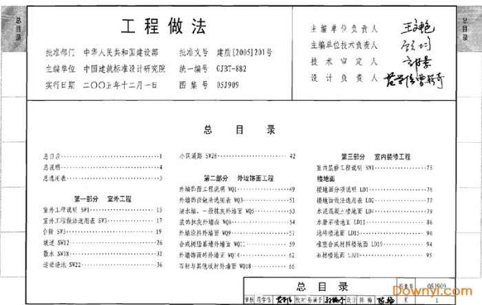 05j909工程做法图集内容符合当前国家节能、环保要求,按全国各气候分区、地质分布的特点,基本将民用建筑 与一般工业建筑的常用做法编入图集,补充一些技术上成熟的新材料、新工艺、新体系的做法