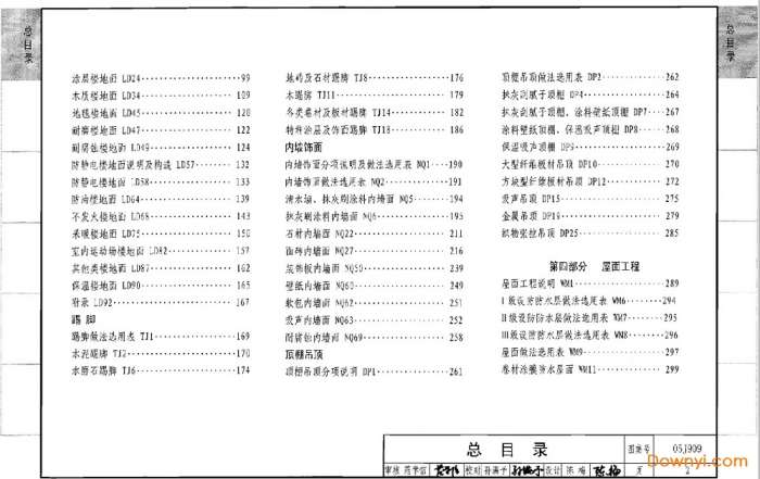 考虑到使用者的不同需求:05j909图集前面提供了方便设计快速选用的索引表;同时各章节中的选用表又将不同做法进行详细的索引,为使用者对各种做法深入了解提供便利。