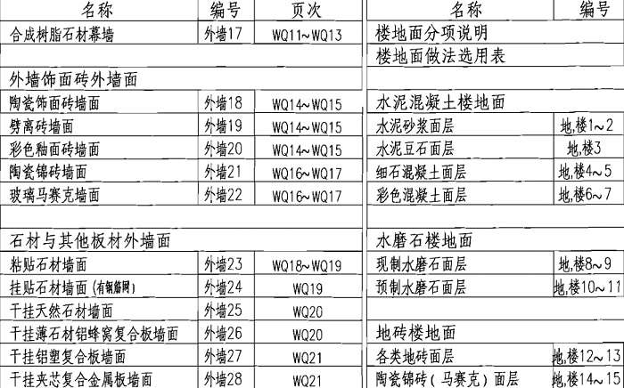 图集分为室外工程、外墙饰面工程、室内装修工程、屋面工程、建筑涂料五部分的工程做法及材料附表、附录。