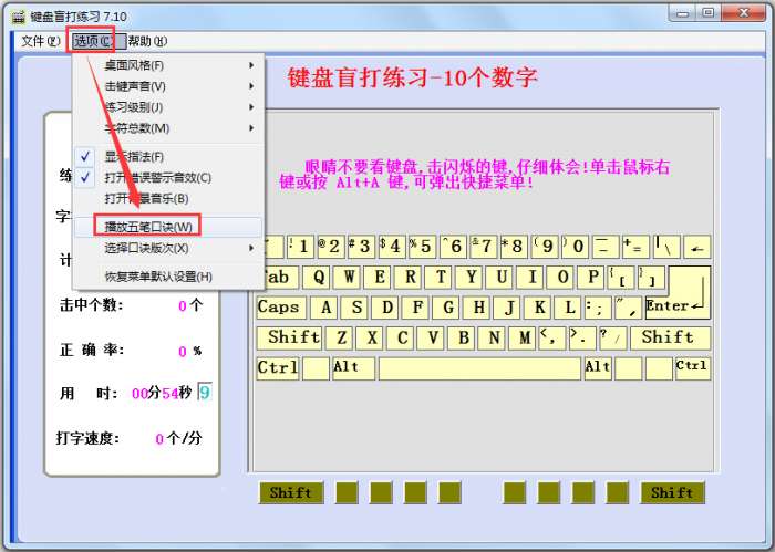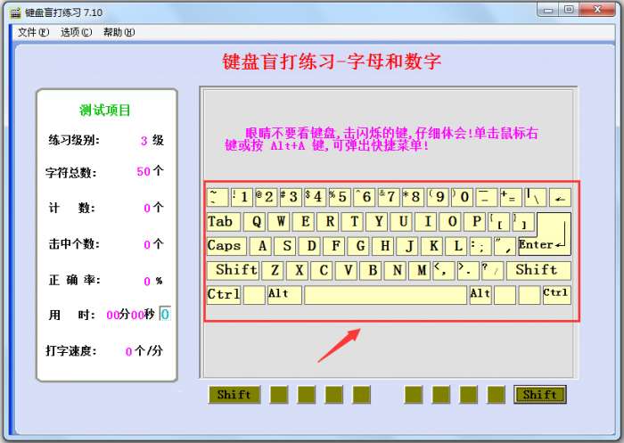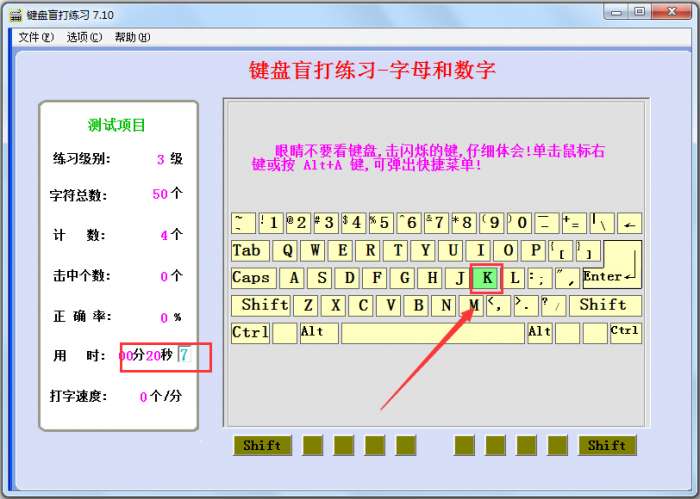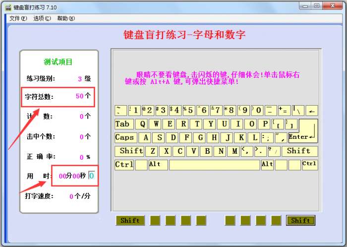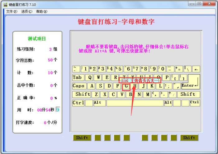 2、画面左上方显示的是目前已经使用的时间,后面的是目前打字的成功率,每次在练习的时候可以将上次的结果记录下来,然后进行对比,就知道自己的水平是否有所提高。