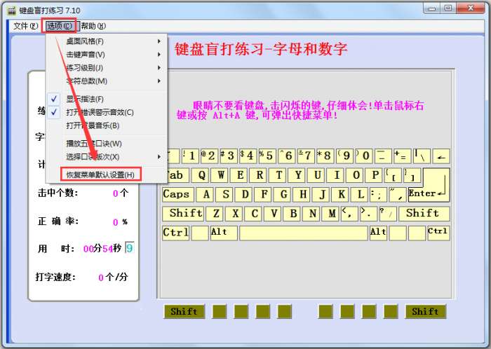 10、恢复菜单默认设置——桌面风格为显示键盘——字母和数字、击键声音为语音报键、练习级别为3级、字符总数为50个、打开错误警示音效为打开、打开背景音乐为关闭、选择五笔版次为98版本。