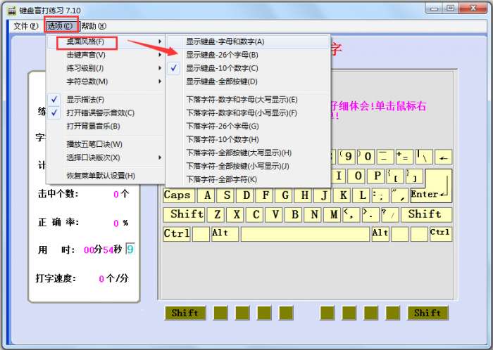 5、显示指法——选择是否显示需要击打字符的标准指法。