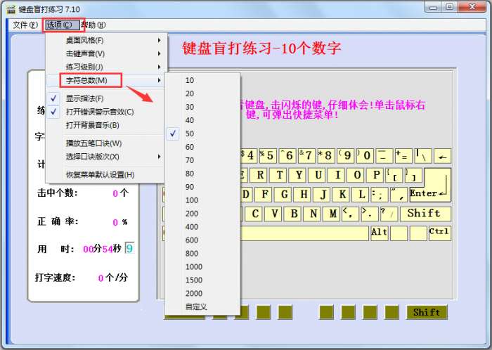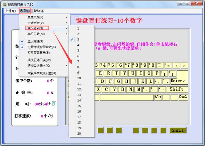3、练习级别——选择字符显示的快慢,级数越大速度越快,难度也越大。