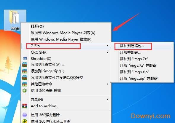 1、比如说我的桌面有一个名为imgs的文件夹要对它进行压缩,这里我们可以点击文件夹选择7-zip——“添加到压缩包”。点击后我们就会进入添加到压缩包界面。