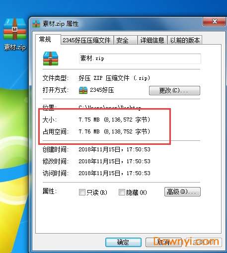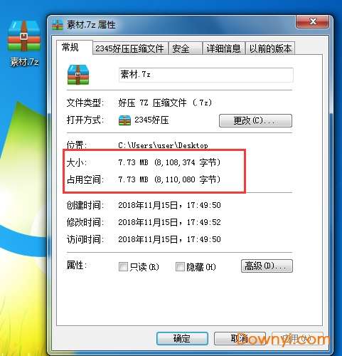 3、压缩完成后,我们找到已经压缩的包,右击点击属性,这里我们看到文件大小已经比之前小了好多。如果还想再缩小压缩包的话,很容易导致文件受损,所以请用户谨慎选择。