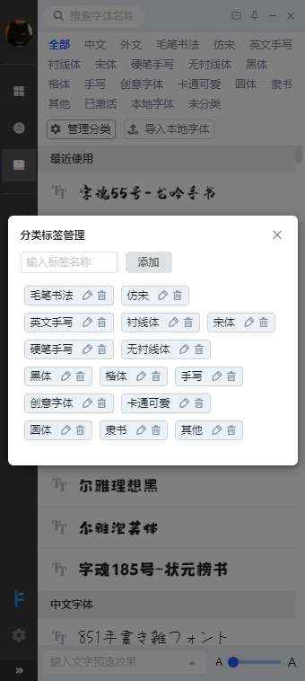 全新的本地+线上字体管理功能,用户可以自定义管理标签分类以及分类下的字体,帮助用户高效用字。