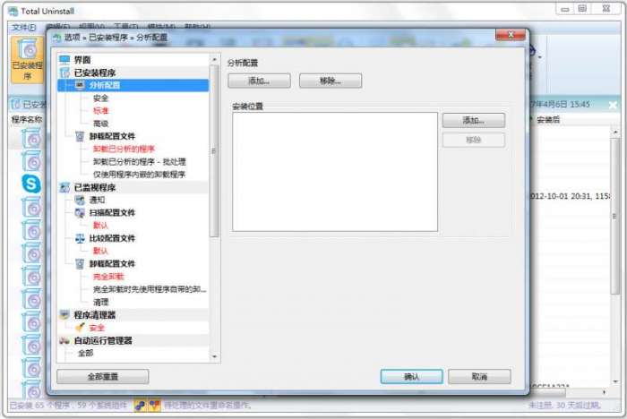 Total Uninstall的功能划分成若干模块,比如分析模块,卸载模块,监控模块,清理模块等。每个模块有默认的配置参数,比如分析模块,默认安全,标准,高级三种配置。