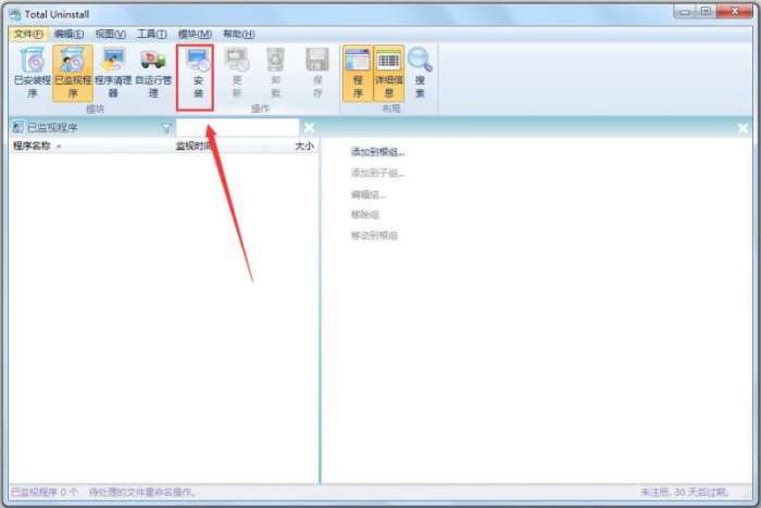 1、运行Total Uninstall 软件。点击“已监控程序”,运行“安装”选项。