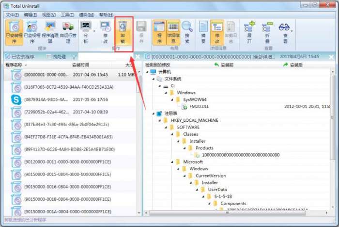 Total Uninstall点击分析模块按钮,Total Uninstall会帮助你分析软件的安装文件位置,注册表位置。分析完成后,你会看到完整的软件结构。