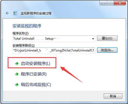 4、安装程序路径中有内容后,点“启动安装程序”。不是通常的直接安装软件,而是用Total Uninstall 软件来进行安装。