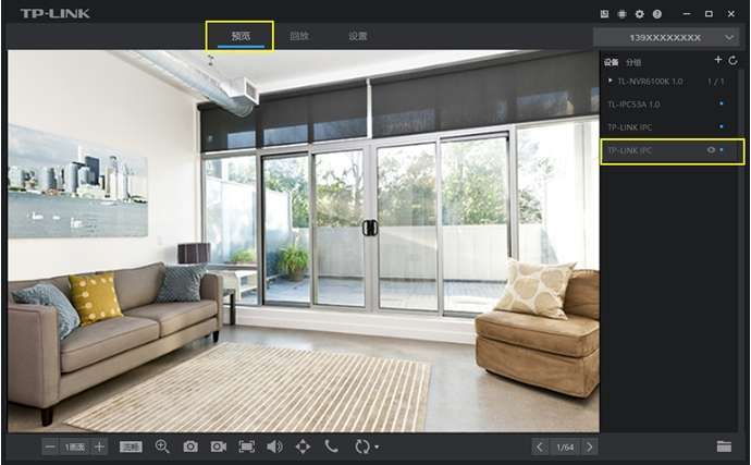 在客户端的预览界面,【设备】或【分组】中选择需要观看的IPC,即可观看远程实时监控画面了。
